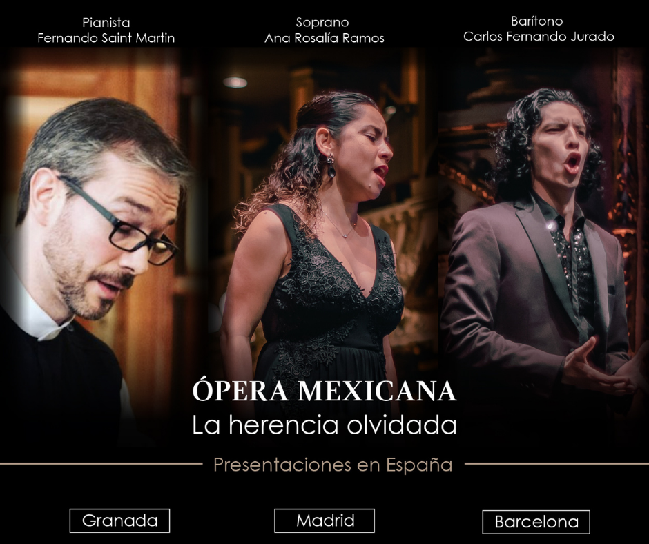 El Centro de Estudios Mexicanos de la UNAM en España invita al concierto “Ópera mexicana. La herencia olvidada” que se celebrará los días 1, 3 y 4 de diciembre en las ciudades de Granada, Madrid y Barcelona. Participan en el concierto la soprano Ana Rosalía Ramos, el barítono Carlos Fernando Reynoso Jurado y el pianista Fernando Saint Martín.
